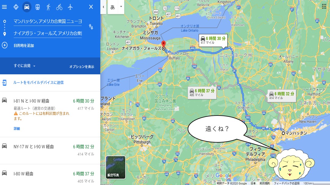 「お隣同士の国だし、ニューヨークってアメリカの北のほうだから近いんじゃね?」